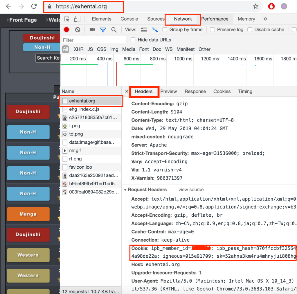 - 此时右边栏会显示exhentai.org的一些相关信息。我们需要的Cookie在header这一栏;
