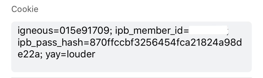 我试了下,直接把桌面Chrome的Cookie复制到规则中的自定义Cookie一栏也是可以正常浏览的。当然你也可以只复制igneous、ipb_member_id、ipb_pass_hash三个参数,然后自己加上yay=louder。