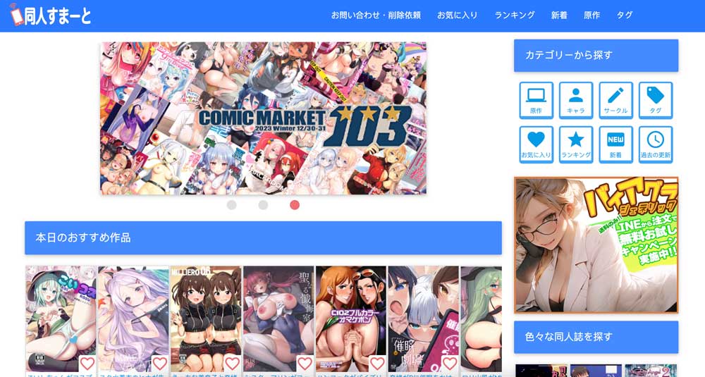 エロ同人誌、エロ漫画が無料で読み放題のサイトです。 24冊以上の新作を毎日更新中!! 新作アニメ・ゲームなどの最新コンテンツはもちろん、根強い人気を誇る古い作品まで幅広い同人誌を更新してます。